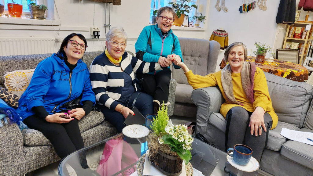 Kuva Ikiviikarien järjestäytymiskokouksesta 2023 Järvenpäässä. Kimppakuvaan ovat päätyneet Terttu Sihvola-Rauttu, kuvassa vasemmalla, puheenjohtaja Pippi Nevalainen, Raija Kinnunen ja Kaija Tuuri.